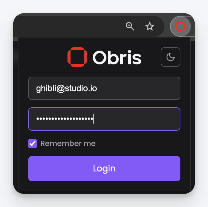 - Click the Obris icon in your browser toolbar and log in with your Obris account credentials.