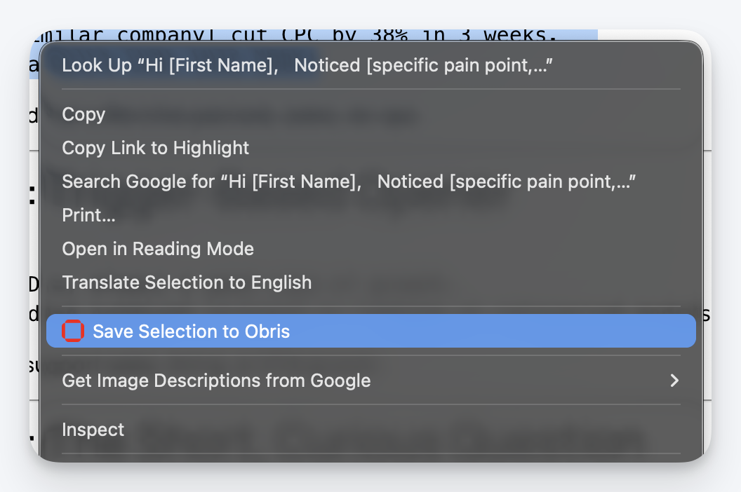 - Choose Save Selection to Obris when text is highlighted, or Save Page to Obris when no text is selected.