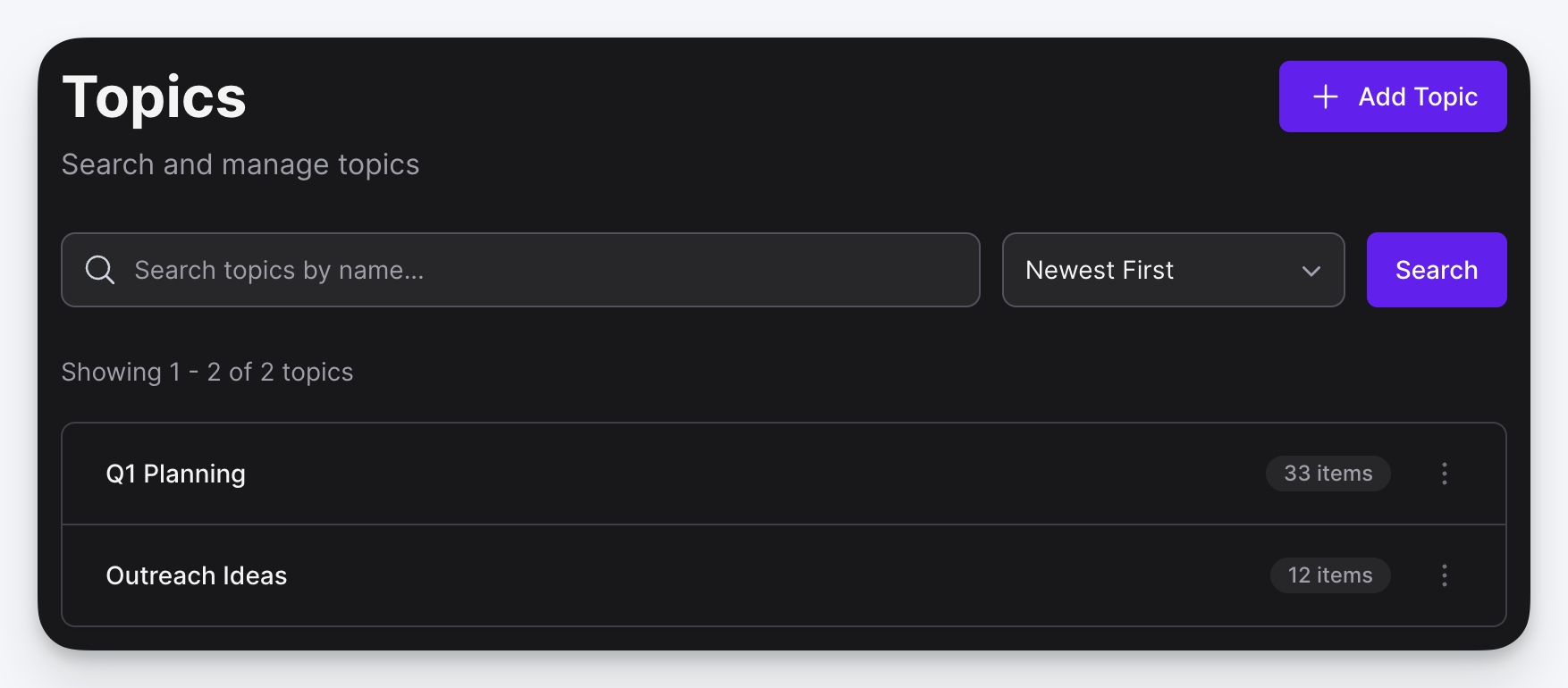 - Create a topic: Type a name in the "New topic" field inside any topic selector. The topic is created instantly and selected.
